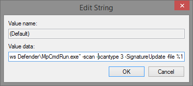 “C:Program FilesWindows DefenderMpCmdRun.exe” -scan -scantype 3 -SignatureUpdate -file %1